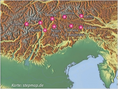 Hinweis: Diese MTB-Tour bietet ein grandioses Panorama auf das Gebiet der Seiser Alm und auf die Dolomiten. Obwohl Tourlänge und Höhenunterschied nicht extrem sind, sollte man nicht unterschätzen, dass die Anstiege unter der Sonne, ohne schattenspendende Bäume, gemacht werden! Übernachtung im Raum Brixen.